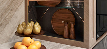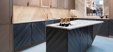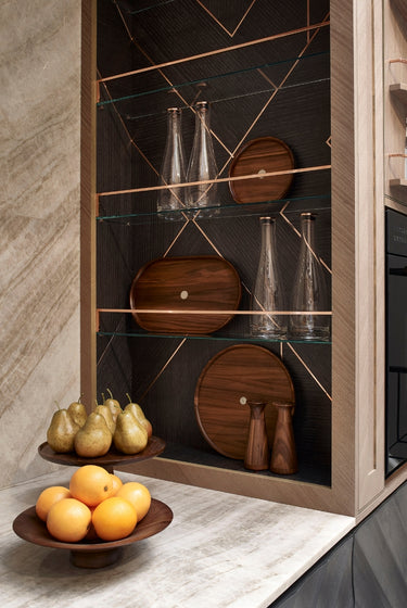 The upper cabinetry is inspired by classical parquetry using light oak veneers angled at 45 degrees. For the lower cabinetry section, a dark grey oak has been used to create the innovative 3D quilted cabinetry first seen at Masterpiece. The bookmartched stone slabs are Taj Mahal Quartzite.