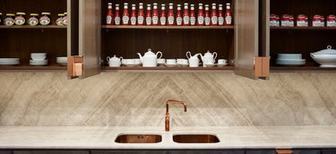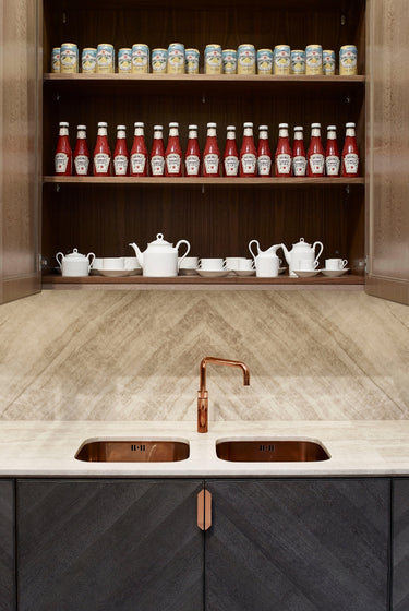 Inspired by David Linley, the marquetry detailing of some of the nation’s favourite condiments add a tongue in cheek twist to the cabinetry. The tap is from Quooker and provides hot, cold, and boiling water. All the metal detailing is bespoke with copper finishes.