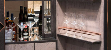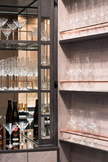 The charcoal oak exterior of the Quantum bar is segmented by a copper stringing pattern which directs the path of the wood grain. Within the bar, the copper shelving provides a striking contrast with the light figured anigre of the doors. The back and central sections of the bar are all mirrored to reflect the crystalware, adding to the handsome interior.