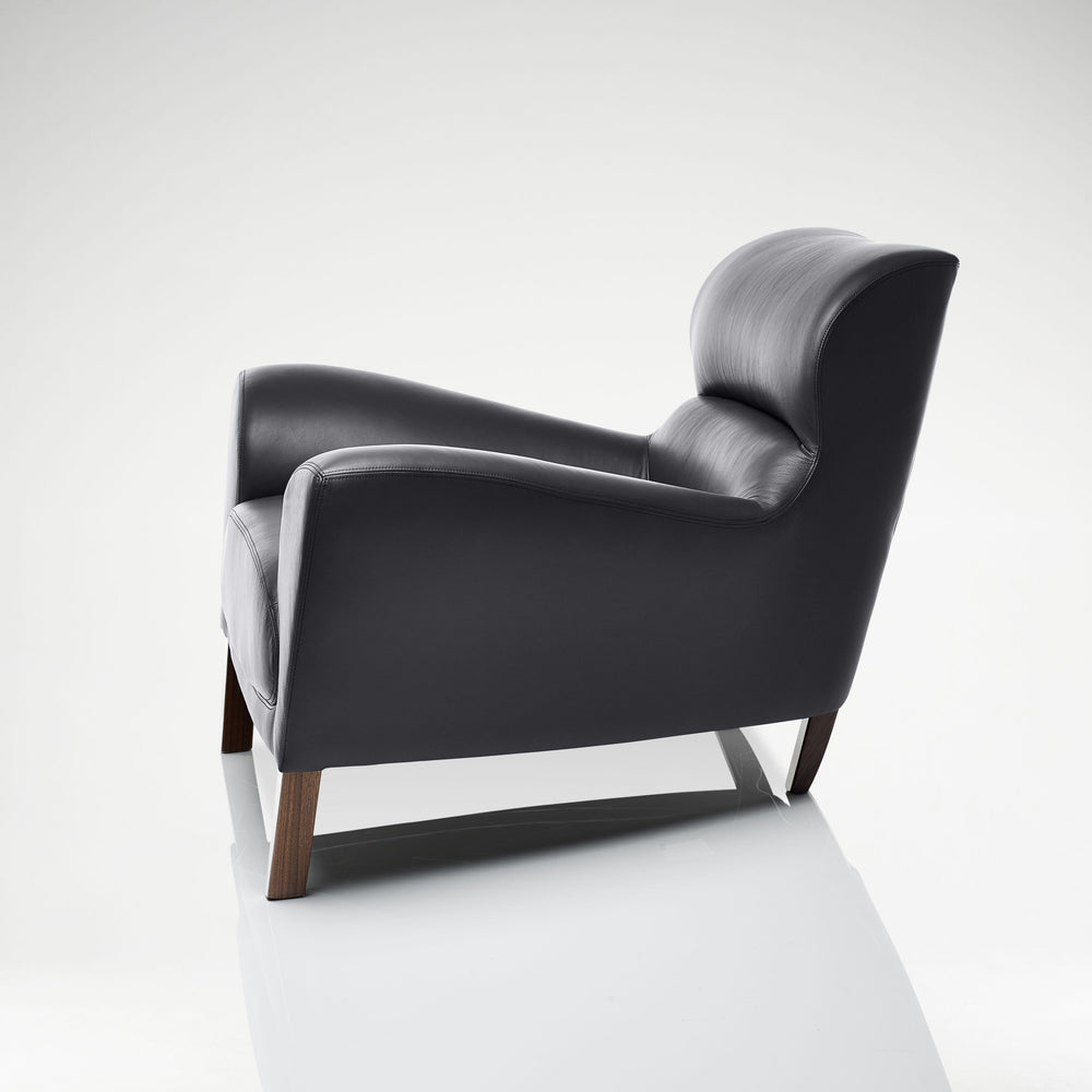 Newly upholstered in a midnight leather from Whistler Leather, the Aston Chair has become an iconic LINLEY piece, instantly recognisable by its voluptuous curved form. Its compound curves are moulded like a car seat is formed around the body, to ensure maximum comfort and relaxation. The Aston and Astonette Chairs stand on walnut legs and are available to purchase in a range of Osborne & Little fabrics and Whistler Leathers or the client's own material.