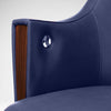 Upholstered in crimson blue leather, the chair's height can be adjusted via a subtly hidden titanium button on the inside of the chair up to a 50cm seat height.