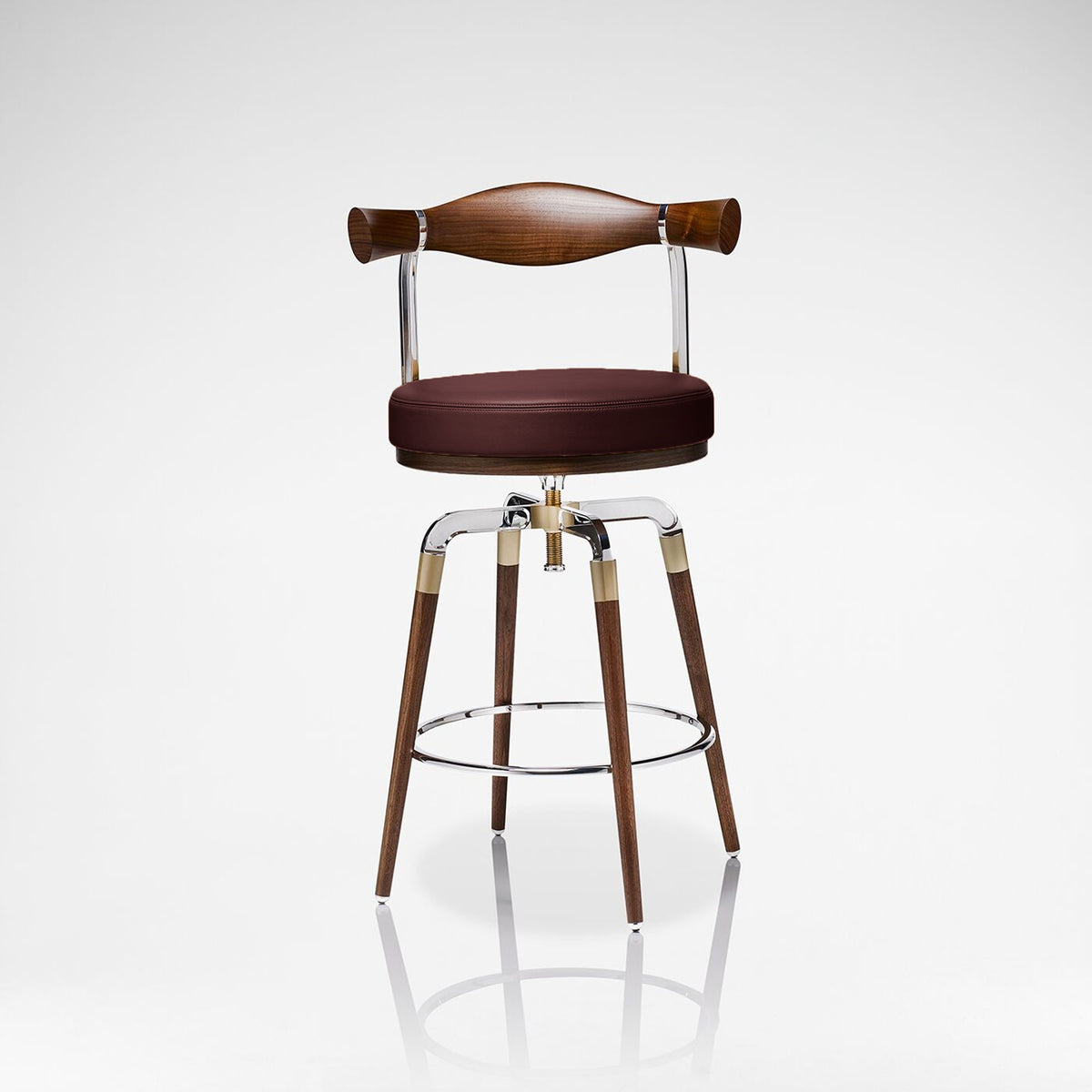 Crafted in walnut, engineered brushed brass and polished aluminium, the Rifle Bar Stool has an adjustable seat height making this ideal for your home bar.