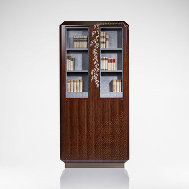 Created over 1,000 hours, the distinguished drinks cabinet has a bookcase front which rotates inwards to reveal a luxurious bar, as well as drawers for barware and accessories. The veneers are embellished with geometric patterns morphing into straight grain, with an ornate marquetry of jasmine flowers crafted with mother of pearl, quilted maple, figured sycamore and satinwood.