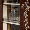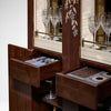 Barware accessories are found within the hidden drawers and include: Waiter's Friend corkscrew, Silver Corkscrew and Bottle Opener Set, spirit measure, 6 olive sticks, bespoke chopping board, 2 sets of 4 coasters and a knife with walnut handle.