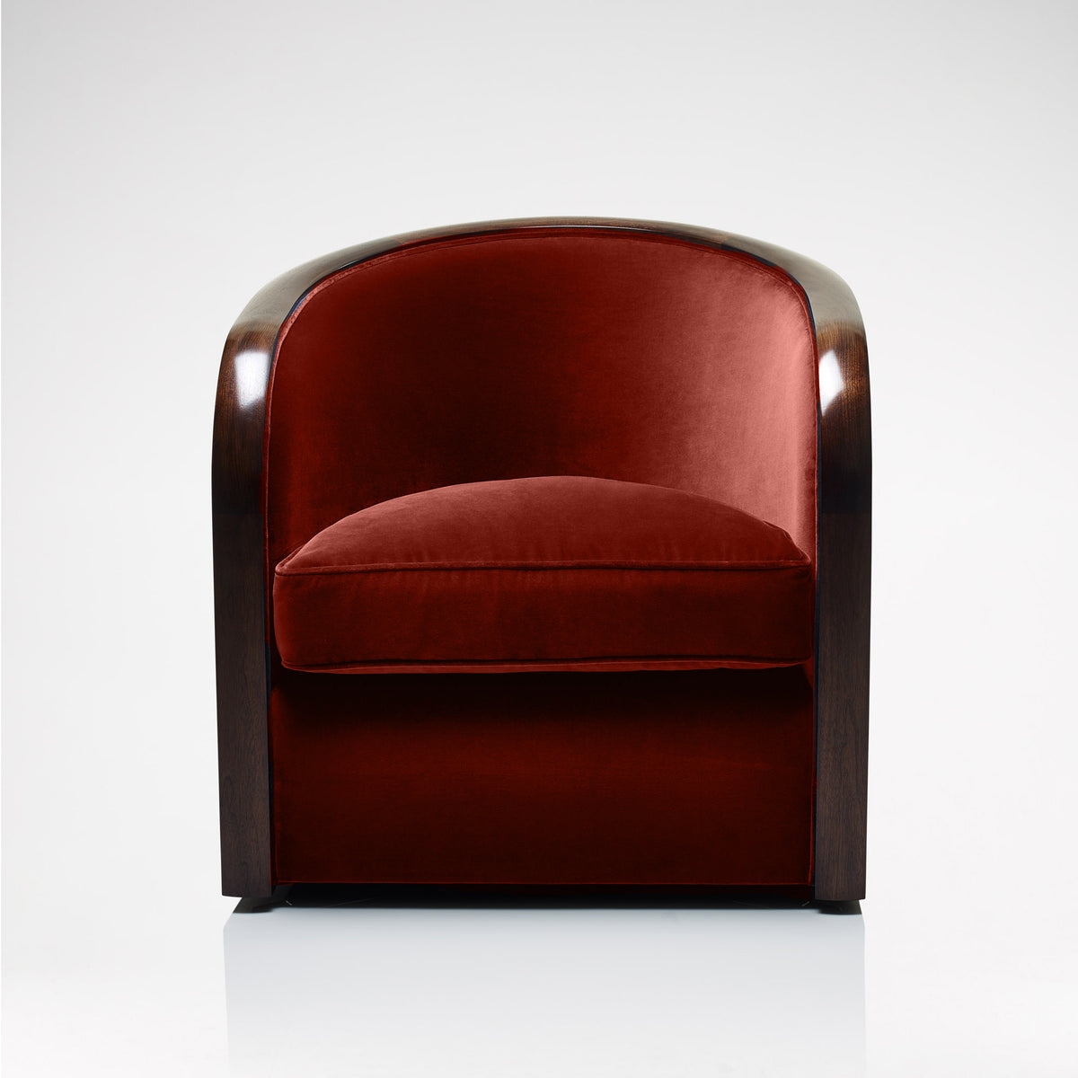 The Savoy Swivel Chair is handcrafted using traditional methods. Classically made, the chair in navy has hand-tied springs with a sprung cane edge. The foam core is wrapped in duck feather and down to allow extra bounce and comfort. The edge of the frame has been crafted in American Walnut and the showwood back is made from figured anigre.