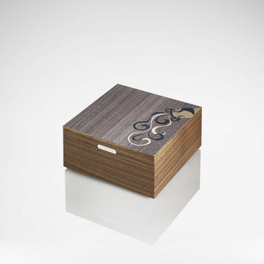 Hand-crafted in walnut, this Zodiac Box features a marquetry design in blue eucalyptus, grey figured anegre, grey tay and pink movigne, r... Read more
