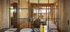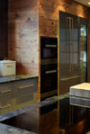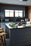 Granite flooring and Mystic Grey Satino granite worktops provide a contemporary contrast to the warm tones of the timber. Beaten copper splashbacks and sleek glass and steel appliances bring additional texture and visual depth, contributing to a design that balances raw authenticity with refined modern craftsmanship.