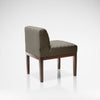 The dining chair is upholstered in onyx leather with cut-out arms and walnut legs.