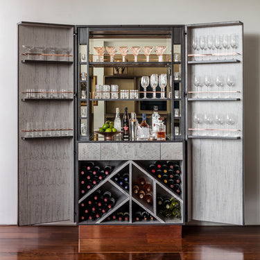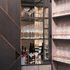 The bar's mirrored back and central sections add depth and allure, reflecting the sparkling beauty of your crystalware. This handsome interior enhances the overall ambiance and creates a sophisticated atmosphere for entertaining.