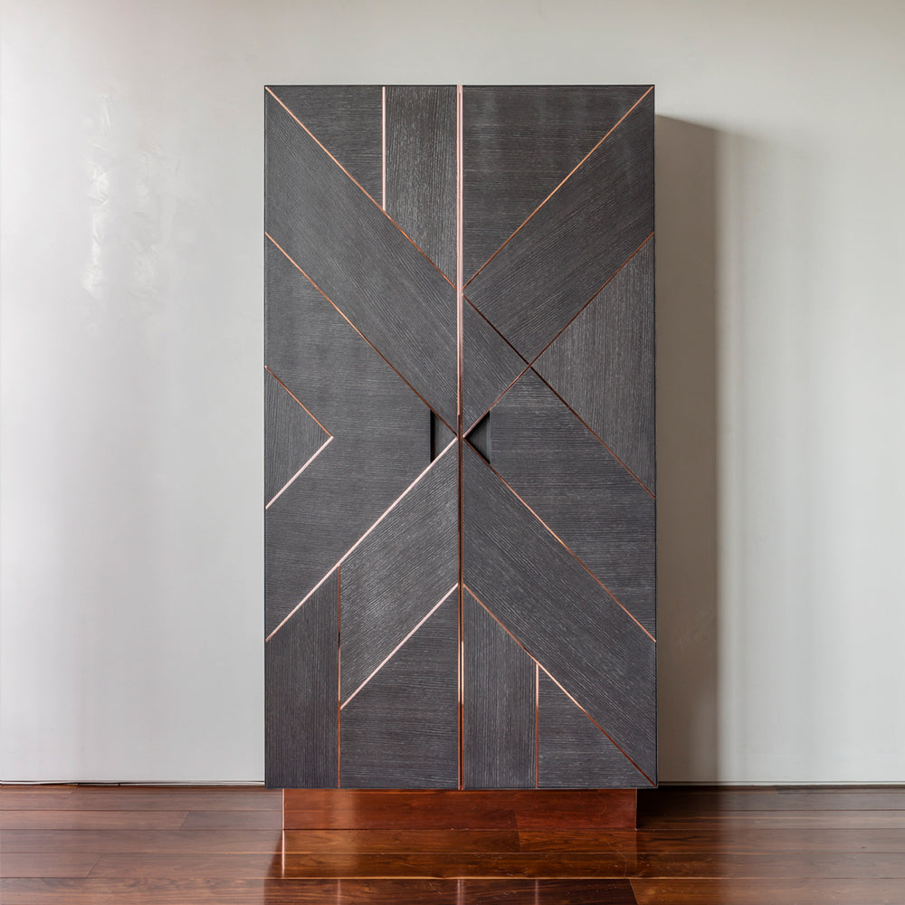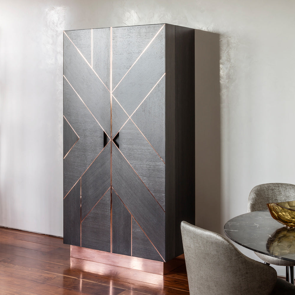 Experience refined elegance with our stunning Quantum Bar. Its charcoal oak exterior is beautifully segmented by a copper stringing pattern, accentuating the natural wood grain. Inside, the copper shelving provides a striking contrast against the light-figured anigre doors, creating a captivating visual composition.